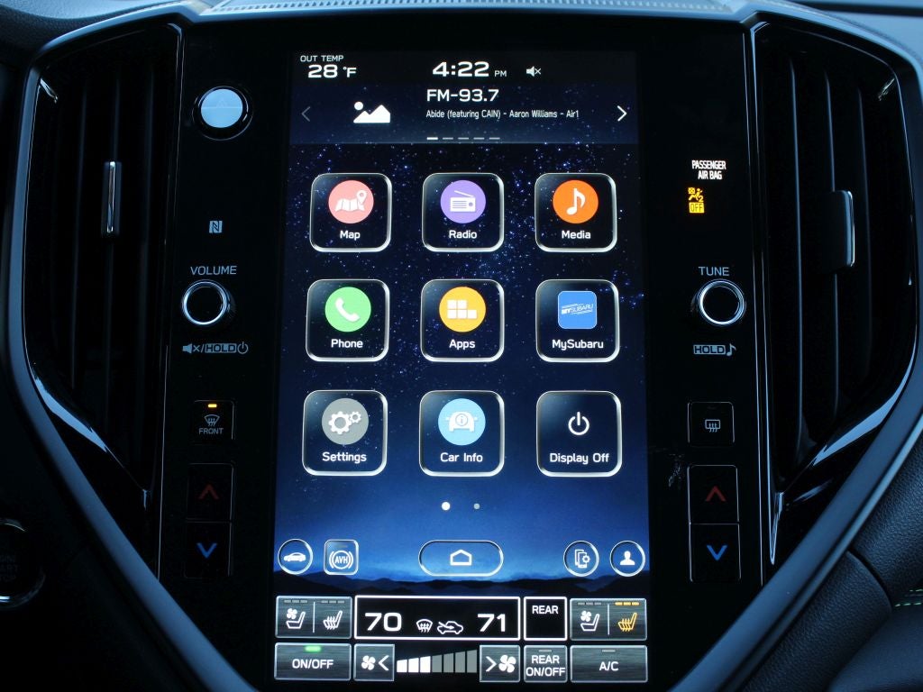 - Radio: Subaru 11.6" Multimedia System w/Navigation -inc: AM/FM stereo HD Radio, multi-touch gesture high resolution display screen, voice activated controls for radio and navigation, Bluetooth® audio streaming and hands-free phone connectivity w/SMS text messaging connectivity (refer to subaru.com for cell phone compatibility), TomTom navigation software w/what3words, iPod control capability, smartphone integration for Android Auto and Apple CarPlay w/full screen view and wireless connection, USB audio system update, audio system control switches, hands-free phone switches and voice command talk switch on steering wheel, harman/kardon quantum logic surround sound speaker system w/14 speakers, subwoofer and harman/kardon 792 watt equivalent maximum output amplifier, illuminated 3.5mm auxiliary input jack, illuminated USB A and C input/charge ports, SiriusXM w/360L (4 months free trial included/subscription required after) and SiriusXM Travel Link (4 months free trial included/subscription required after)