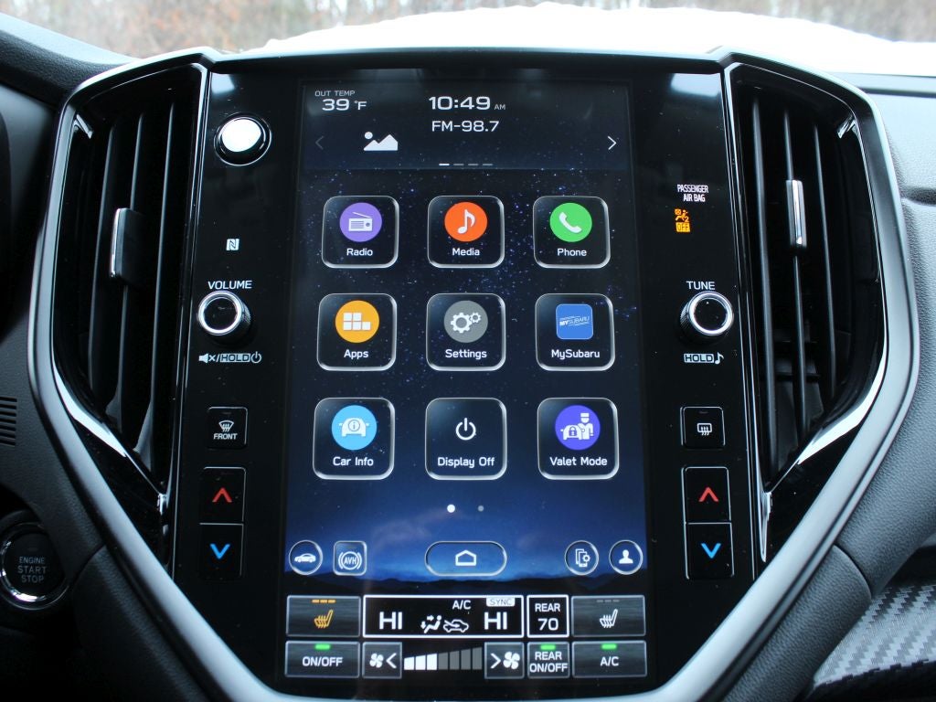 - Radio: Subaru 11.6" Multimedia Plus System -inc: AM/FM stereo HD Radio, multi-touch gesture high resolution display screen, voice activated controls, Bluetooth® audio streaming and hands-free phone connectivity w/SMS text messaging connectivity (refer to subaru.com for cell phone compatibility), iPod control capability, smartphone integration for Android Auto and Apple CarPlay w/full screen view and wireless connection, USB audio system update, audio system control switches, hands-free phone switches and voice command talk switch on steering wheel, 6 speakers, illuminated 3.5mm auxiliary input jack, illuminated USB A and C input/charge ports, SiriusXM w/360L (requires an active subscription: 4 months free trial included/subscription required after) and SiriusXM Travel Link (requires an active subscription: 4 months free trial included/subscription required after)