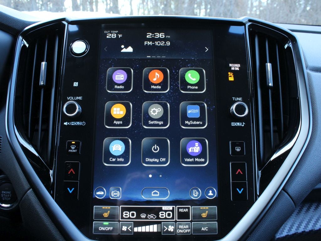 - Radio: Subaru 11.6" Multimedia Plus System -inc: AM/FM stereo HD Radio, multi-touch gesture high resolution display screen, voice activated controls, Bluetooth® audio streaming and hands-free phone connectivity w/SMS text messaging connectivity (refer to subaru.com for cell phone compatibility), iPod control capability, smartphone integration for Android Auto and Apple CarPlay w/full screen view and wireless connection, USB audio system update, audio system control switches, hands-free phone switches and voice command talk switch on steering wheel, 6 speakers, illuminated 3.5mm auxiliary input jack, illuminated USB A and C input/charge ports, SiriusXM w/360L (requires an active subscription: 4 months free trial included/subscription required after) and SiriusXM Travel Link (requires an active subscription: 4 months free trial included/subscription required after)