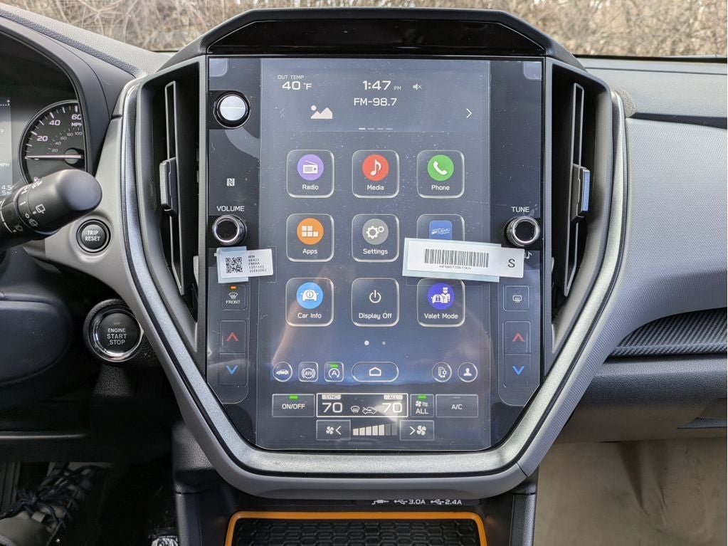 - Radio: Subaru 11.6" Multimedia Plus System -inc: AM/FM stereo, HD Radio, multi-touch gesture high resolution display screen, voice activated controls, Bluetooth® audio streaming and hands-free phone connectivity, Bluetooth® hands-free SMS text messaging connectivity, iPod control capability, smartphone integration: wired and wireless Android Auto w/full screen view and wireless Apple CarPlay w/full screen view, USB and Over The Air (OTA) audio system update, steering wheel audio system and Bluetooth® control switches, 6 speakers (2 dash panel tweeter, 2 front door and 2 rear door), illuminated 3.5mm auxiliary input jack, illuminated front USB A and C input/charge ports, connected services operation indicator, SOS emergency assistance: red SOS button and enhanced roadside assistance: blue i-button