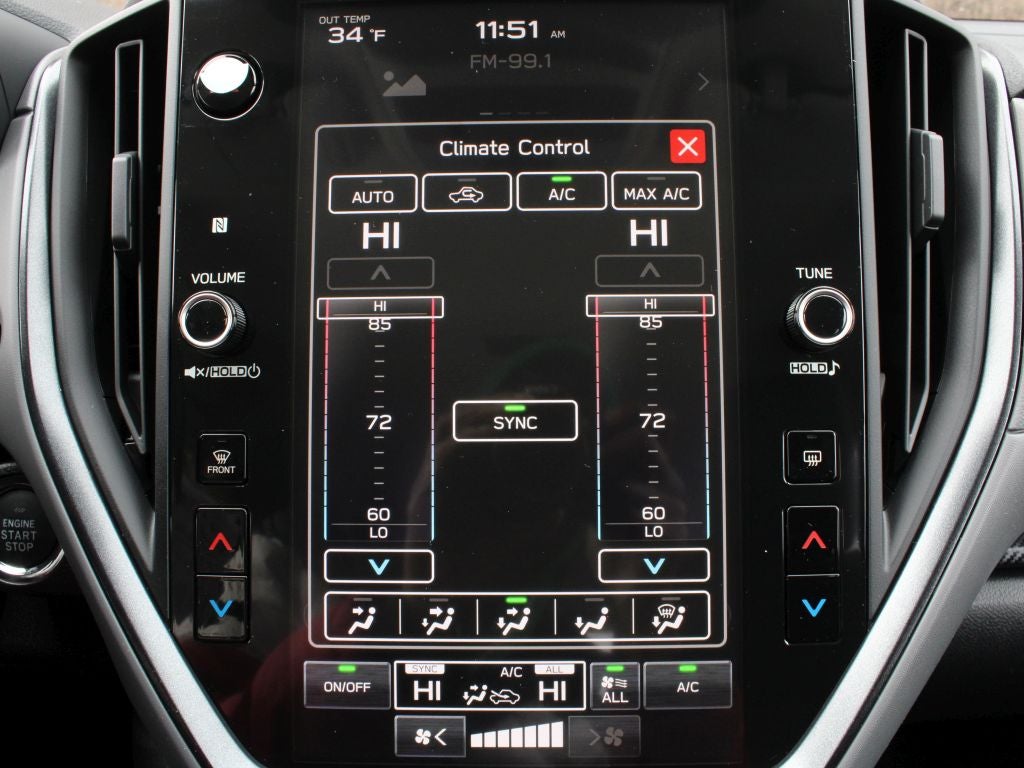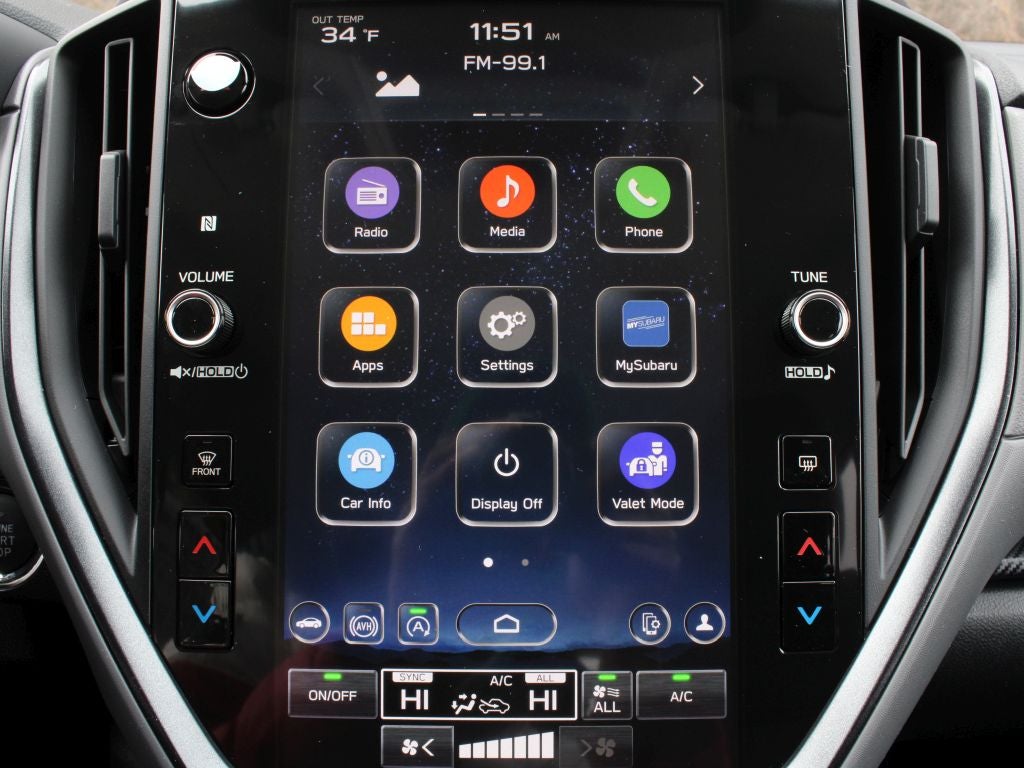 - Radio: Subaru 11.6" Multimedia Plus System -inc: AM/FM stereo, HD Radio, multi-touch gesture high resolution display screen, voice activated controls, Bluetooth® audio streaming and hands-free phone connectivity, Bluetooth® hands-free SMS text messaging connectivity, iPod control capability, smartphone integration: wired and wireless Android Auto w/full screen view and wireless Apple CarPlay w/full screen view, USB and Over The Air (OTA) audio system update, steering wheel audio system and Bluetooth® control switches, 6 speakers (2 dash panel tweeter, 2 front door and 2 rear door), illuminated 3.5mm auxiliary input jack, illuminated front USB A and C input/charge ports, connected services operation indicator, SOS emergency assistance: red SOS button and enhanced roadside assistance: blue i-button
