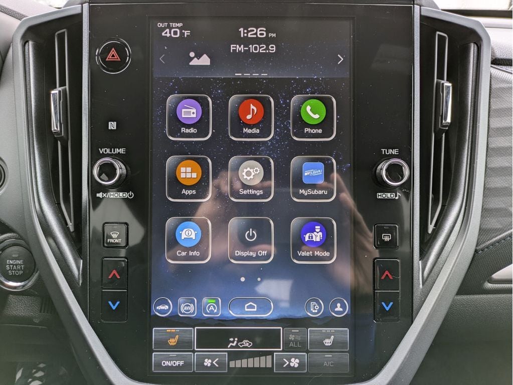 - Radio: Subaru 11.6" Multimedia Plus System -inc: valet mode, integrated center information display, AM/FM stereo HD Radio, multi-touch gesture high resolution display screen, voice activated controls, Bluetooth® audio streaming and hands-free phone connectivity w/SMS text messaging (refer to Subaru.com for cellphone compatibility), iPod control capability, smartphone integration: Android Auto and Apple CarPlay w/full screen view and wireless connection, SiriusXM satellite radio w/360L (free 4-month trial subscription included), USB and Over The Air (OTA) audio system update, steering wheel controls, 6 speakers, 3.5mm auxiliary input jack and roof mounted audio and satellite antenna