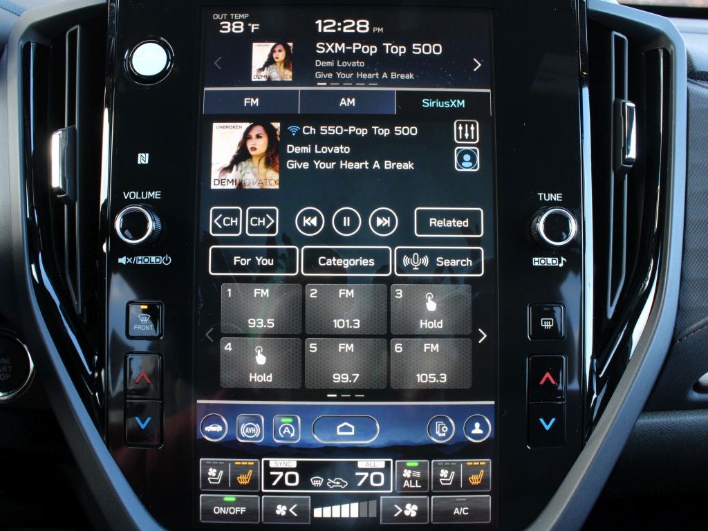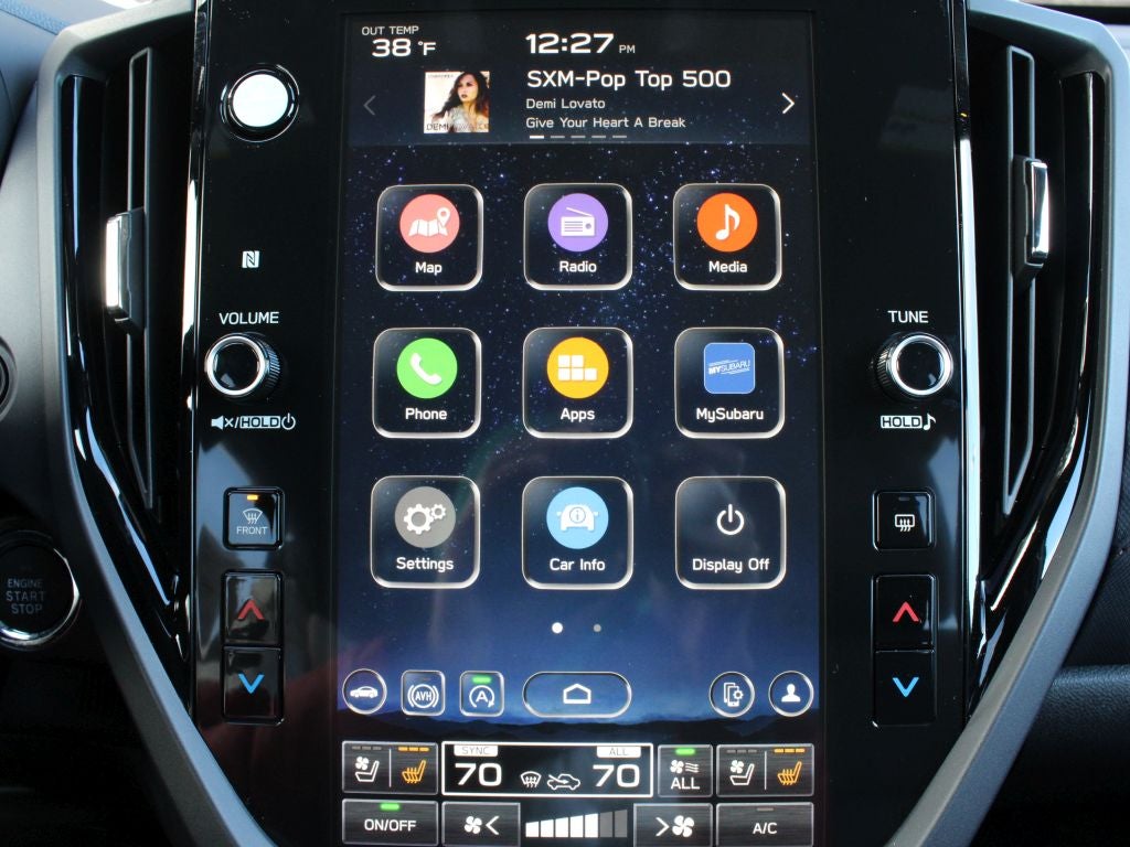 - Radio: Subaru 11.6" Multimedia Navigation System -inc: valet mode, integrated center information display, AM/FM stereo HD Radio, multi-touch gesture high resolution display screen, voice activated controls, voice activated navigation, Bluetooth® audio streaming and hands-free phone connectivity w/SMS text messaging (refer to Subaru.com for cellphone compatibility), TomTom navigation software w/what3words, iPod control capability, smartphone integration: Android Auto and Apple CarPlay w/full screen view and wireless connection, SiriusXM satellite radio w/360L (free 4-month trial subscription included), USB and Over The Air (OTA) audio system update, USB and Map Over The Air (MOTA) TomTom navigation system update (3 years free map updates), steering wheel controls, harman/Kardon speaker system w/11 speakers and 576 watt equivalent maximum output amplifier, 3.5mm auxiliary input jack and roof mounted audio, satellite antenna and SiriusXM Travel Link (4 months free trial included/subscription required after)