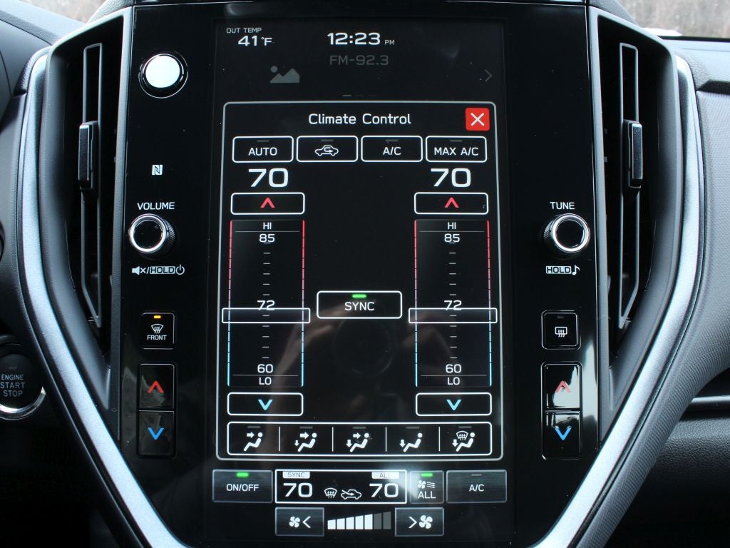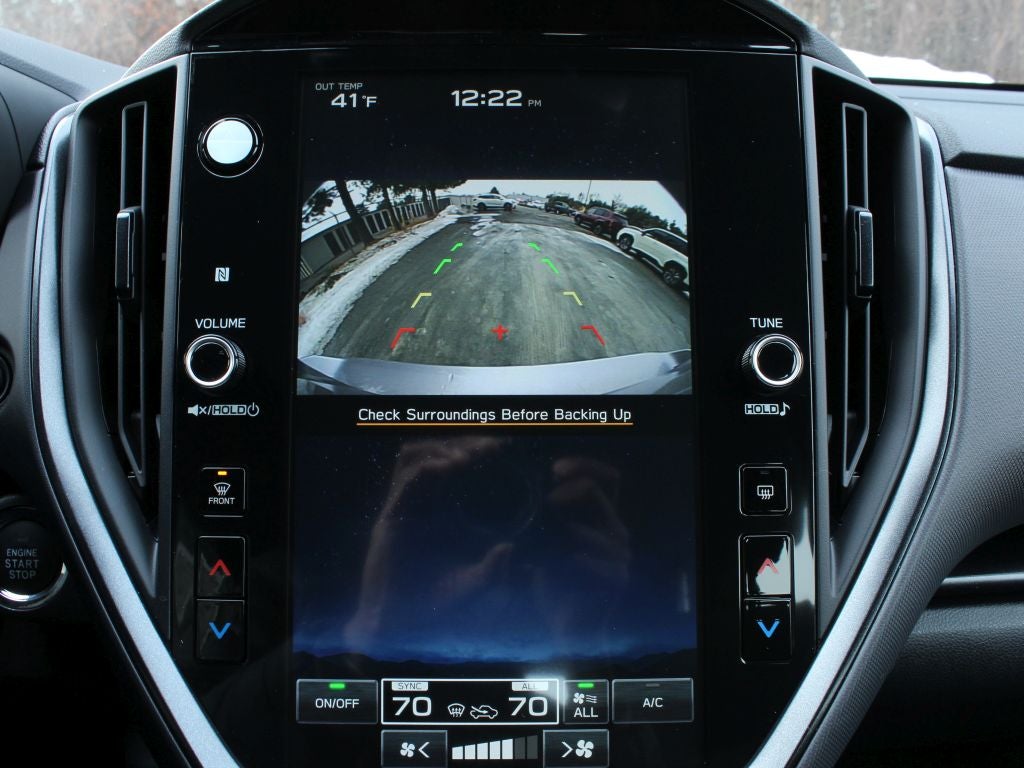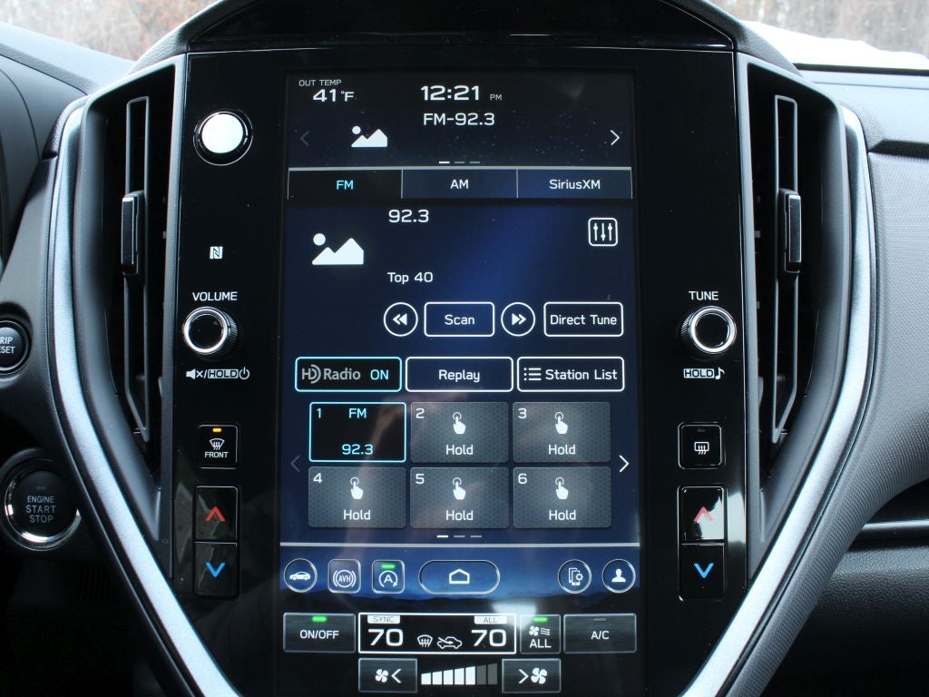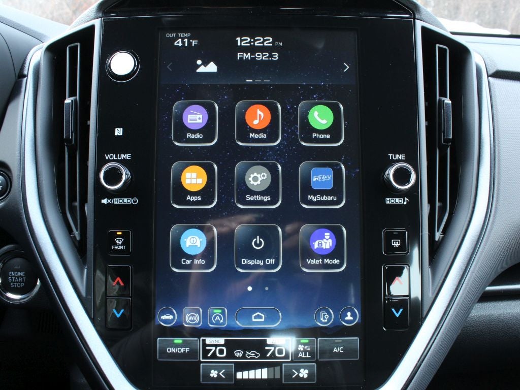 - Radio: Subaru 11.6" Multimedia Plus System -inc: valet mode, AM/FM stereo, HD Radio, multi-touch gesture high resolution display screen, voice activated controls, Bluetooth® audio streaming and hands-free phone connectivity, Bluetooth® hands-free SMS text messaging connectivity, iPod control capability, smartphone integration: wired and wireless Android Auto w/full screen view, wireless Apple CarPlay w/full screen view and wireless connection, USB and Over The Air (OTA) audio system update, audio system and Bluetooth® steering wheel control switches, 6 speakers (2 dash panel tweeter, 2 front door, 2 rear door), illuminated 3.5mm auxiliary input jack, illuminated USB A and C input charge ports, roof mounted satellite and connected services, roof mounted black antenna, connected services operation indicator, SOS emergency assistance (red button) and ehanced roadside assistance (blue i-button)