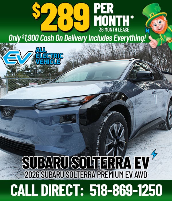 *Stk#S26S3, Model Code: TED-11, MSRP: $40,793. Selling Price: $33,900 (Lease only), Residual value: $23,659.94, Includes $2,000 Subaru Lease Cash and an additional $2,000 NYSERDA rebate for NYS residents only. $289 per month, 36 months. 10,000 miles per year, 15 cents/mile overage. $1,900 due at signing. Payment includes 1st payment, 8% sales tax, Acq. Fee and NYS DMV/DOC fees. Tier 1 credit, minimum FICO score of 700 to qualify. Photo for illustration purposes only. Subject to availability. Expires 3/31/26.