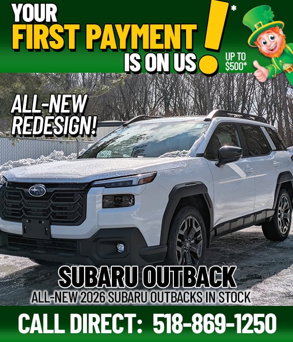 *Maximum First payment up to $500 made directly to customer. Customer is responsible for paying loan provider. Plus tax, title, & DMV/DOC fees. Must present coupon at time of purchase. Cannot be used in conjunction with any other coupon, offer or special; no cash value, not redeemable for cash. Valid on retail purchase of New In-Stock 2026 Subaru Outbacks Only. Excludes orders and prior sales. Expires 3/31/26.