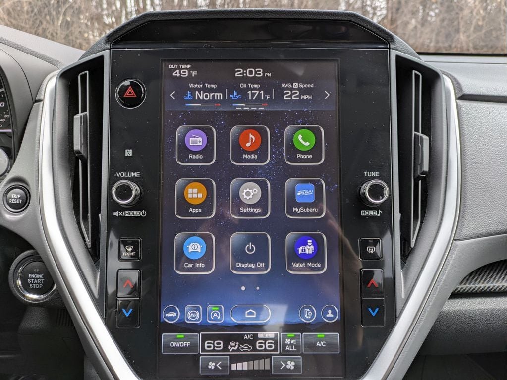 - Radio: Subaru 11.6" Multimedia Plus System -inc: AM/FM stereo, HD Radio, multi-touch gesture high resolution display screen, voice activated controls, Bluetooth audio streaming and hands-free phone connectivity, Bluetooth hands-free SMS text messaging connectivity, iPod control capability, SiriusXM w/360L (4 months free trial included/subscription required after), SiriusXM Travel Link (4 months free trial included/subscription required after), smartphone integration: Android Auto and Apple CarPlay w/full screen view and wireless connection, USB and Over The Air (OTA) audio system update, steering wheel audio system and Bluetooth control switches, 6 speakers (2 dash panel tweeter, 2 front door and 2 rear door), illuminated 3.5mm auxiliary input jack, illuminated front USB A and C input/charge ports and illuminated rear USB A and C charge ports