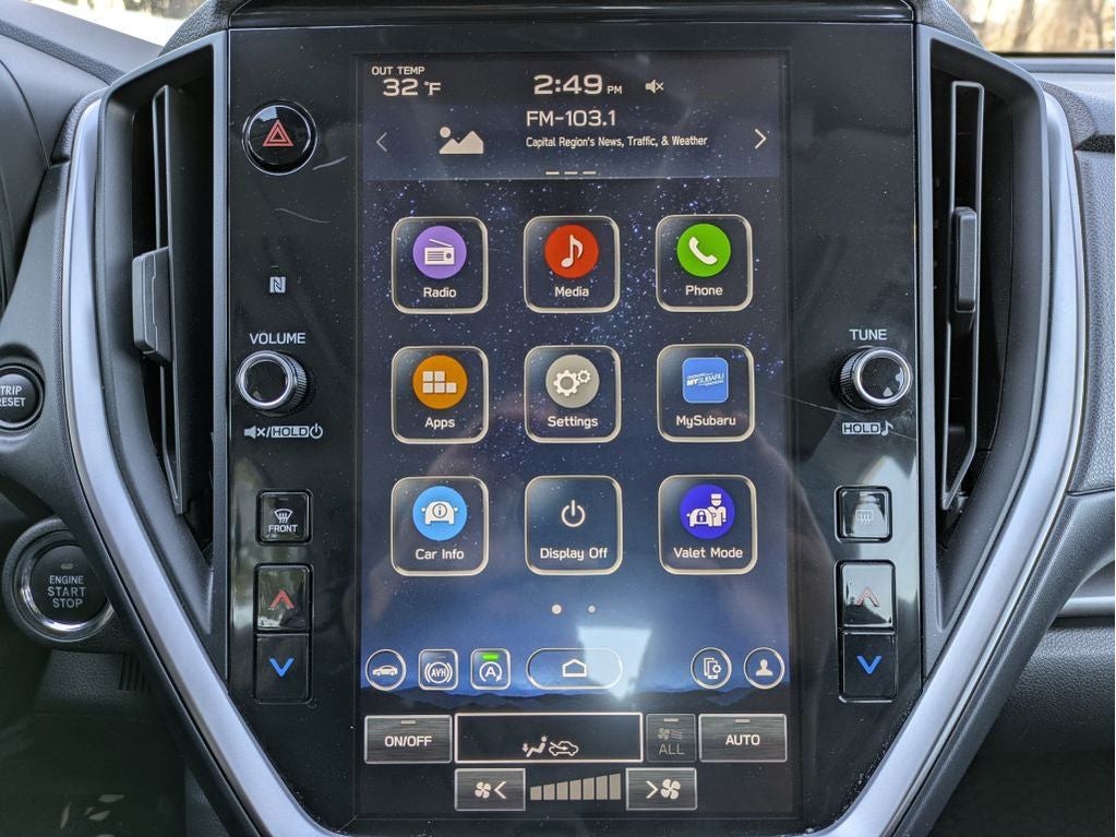 - Radio: Subaru 11.6" Multimedia Plus System -inc: valet mode, AM/FM stereo, HD Radio, multi-touch gesture high resolution display screen, voice activated controls, Bluetooth audio streaming and hands-free phone connectivity, Bluetooth hands-free SMS text messaging connectivity, iPod control capability, SiriusXM w/360L (4 months free trial/subscription required after), SiriusXM Travel Link (4 months free trial/subscription required after), smartphone integration: Android Auto w/full screen view and wireless connection, Apple CarPlay w/full screen view and wireless connection, USB and Over The Air (OTA) audio system update, audio system and Buletooth steering wheel control switches, 6 speakers, illuminated 3.5mm auxiliary input jack, illuminated USB A and C input charge ports, roof mounted black antenna and satellite connected services